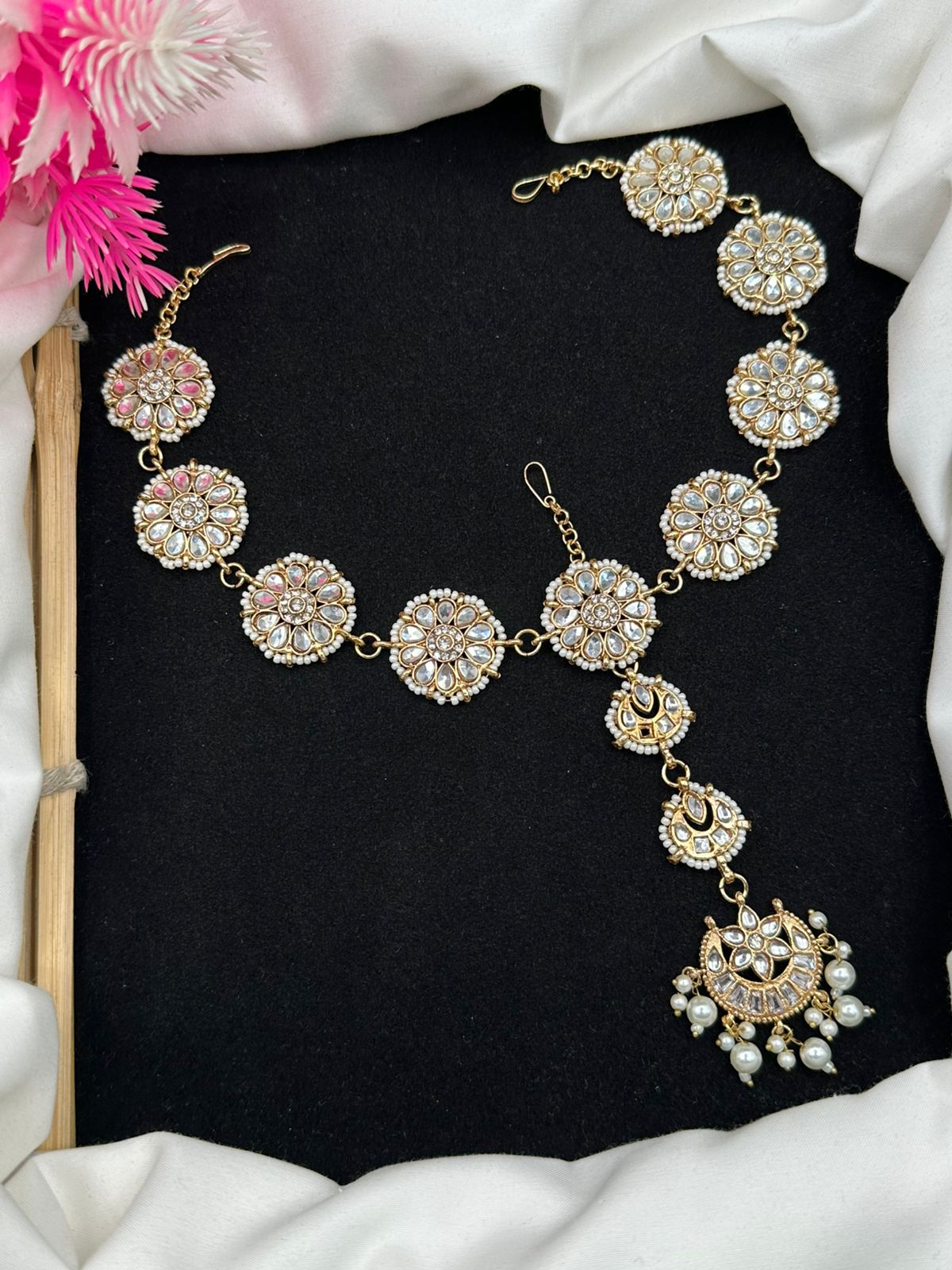 Inspired by Mughal grace, this matha patti radiates timeless beauty with intricate kundan detailing.